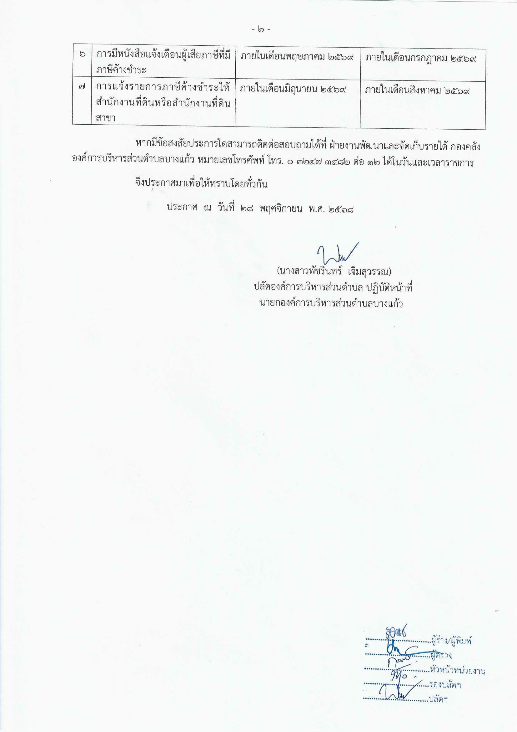 องค์การบริหารส่วนตำบลบางแก้ว จึงออกประกาศให้ผู้เสียภาษีที่ดินและสิ่งปลูกสร้างได้ทราบถึงกรอบระยะเวลาในการดำเนินการจัดเก็บภาษี ประจำปี พ.ศ. 2569 โดยมีรายละเอียด ดังนี้