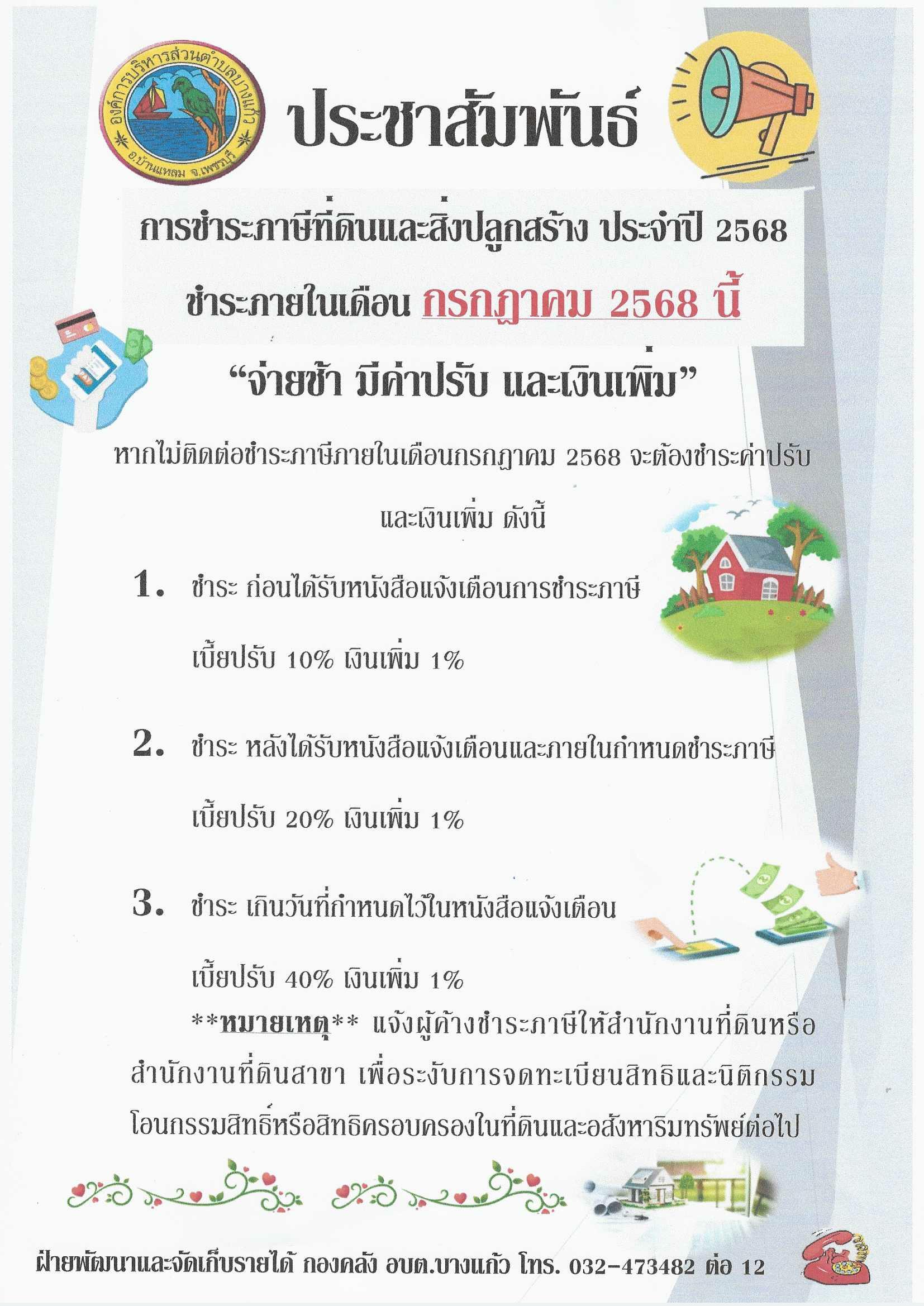 ด้วยฝ่ายพัฒนาและจัดเก็บรายได้ ประชาสัมพันธ์การชำระค่าภาษีที่ดินและสิ่งปลูกสร้าง ประจำปี พ.ศ. 2568 ท่านใดที่ได้รับหนังสือแจ้งประเมินเพื่อเสียภาษีที่ดินและสิ่งปลูกสร้างแล้วยังไม่มาติดต่อชำระ สามารถชำระภายในวันที่ 31 กรกฎาคม 2568 หากมีข้อสงสัยประการใดติดต่อสอบถามได้ที่ ฝ่ายพัฒนาและจัดเก็บรายได้ กองคลัง องค์การบริหารส่วนตำบลบางแก้ว โทรศัพท์ 0-3247-3482 ต่อ 12 ในวันและเวลาราชการ