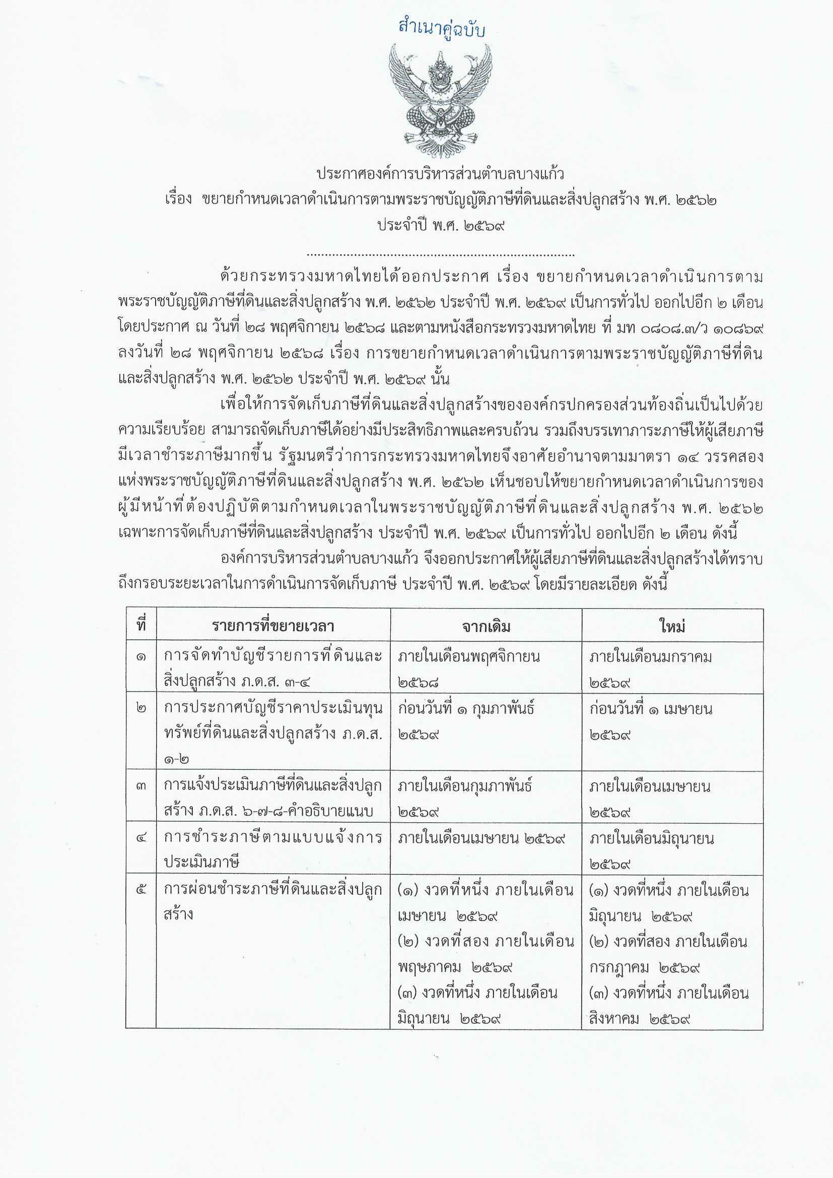 ด้วยกระทรวงมหาดไทยได้ออกประกาศ เรื่อง ขยายกำหนดเวลาดำเนินการตามพระราชบัญญัติภาษีที่ดินและสิ่งปลูกสร้าง พ.ศ. 2562 ประจำปี พ.ศ. 2569 เป็นการทั่วไป ออกไปอีก 2 เดือน โดยประกาศ ณ วันที่ 28 พฤศจิกายน 2568 และตามหนังสือกระทรวงมหาดไทย ที่ มท 0808.3/ว 10869 ลงวันที่ 28 พฤศจิกายน 2568 เรื่อง การขยายกำหนดเวลาดำเนินการตามพระราชบัญญัติภาษีที่ดินและสิ่งปลูกสร้าง พ.ศ. 2562 ประจำปี พ.ศ. 2569 นั้น